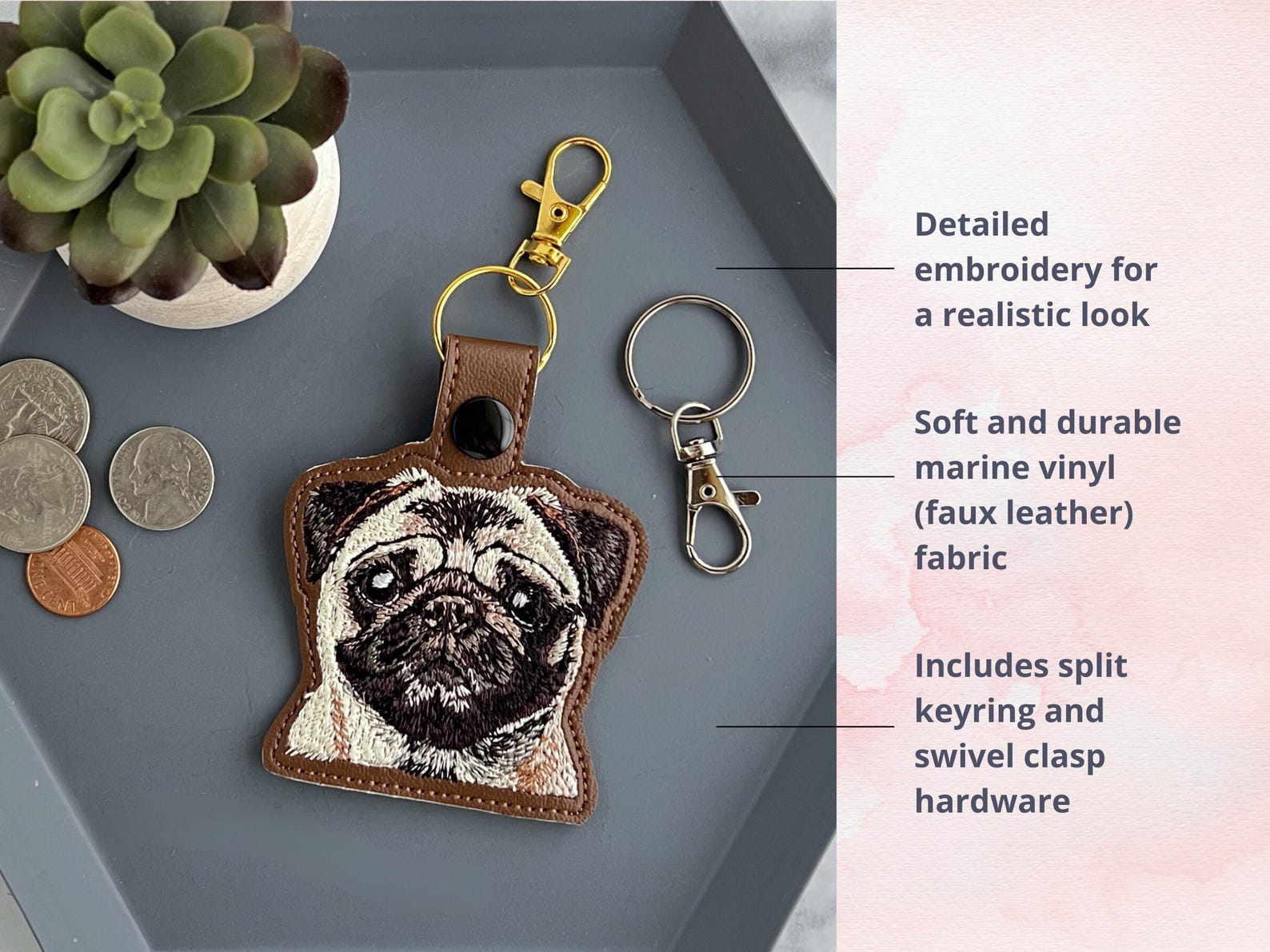 リアルなパグのキーホルダー:刺繍入りのフェイクレザーのキーホルダーまたはバッグチャーム。犬好きの方へのプレゼントに最適!